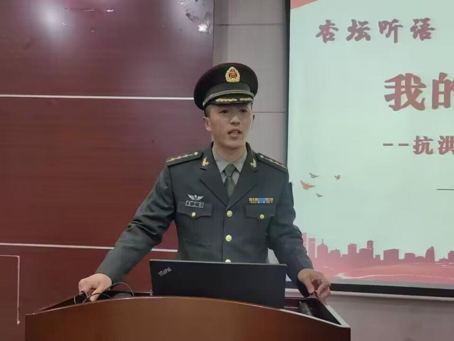 随后,冒小驰现身说法,用铿锵有力的声音为学员们真诚地讲述抗洪故事。在2020年7月22日上午,安徽省庐江县白石天河石大圩段突发决口险情,危急关头之时,他与27名战友组成了党员突击队,在湍急的洪水中组成人墙,转移群众。作为值班员,他把自己安排在了水流最急的地方,而处在最危险位置的他不幸被洪水卷走,卷入漩涡。经过战友们奋不顾身的抢救,在亲人朋友,医生护士的不懈努力和关心下,与死神擦肩而过,身体情况逐渐好转,因其在抗洪救灾中的突出贡献荣立个人二等功。