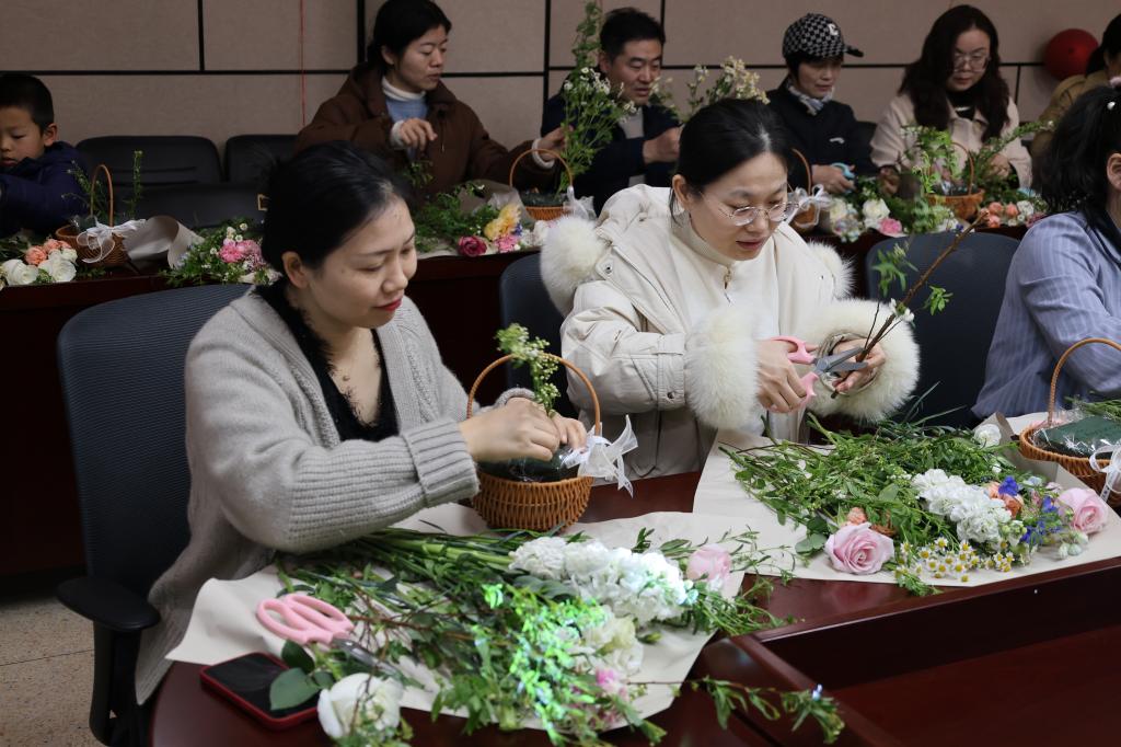 活动现场花香萦绕,在专业花艺老师的悉心指导下,教师们发挥自己的创造力和灵巧的动手能力,从花材的选择、颜色的搭配、插花的技巧和花朵的花语解读等方面,将一支支经过认真修剪的玫瑰、康乃馨、郁金香等象征爱和典雅的花朵装扮进花篮。老师们置身于鲜花丛中,兴致盎然,心中充满了喜悦和成就感。通过每一个独特的花篮,女教师们展现了新时代女性的温馨、优雅和美丽。