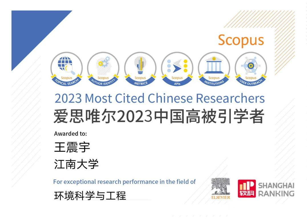3月27日,爱思唯尔(Elsevier)重磅发布了2023“中国高被引学者”(Highly Cited Chinese Researchers)榜单。其中环境科学与工程学科共163人入选。江南大学环境与生态学院王震宇教授继入选Research.com 2023“全球顶尖科学家榜单”、全球学者库2023“全球学者学术影响力排名(终身学术影响力榜)”名录之后,再次荣登2023“中国高被引学者”榜单。王震宇教授连续四年(2020-2023)入选该高被引学者榜单也标志着我校环境学科的科研水平和影响力逐渐持续提升。
