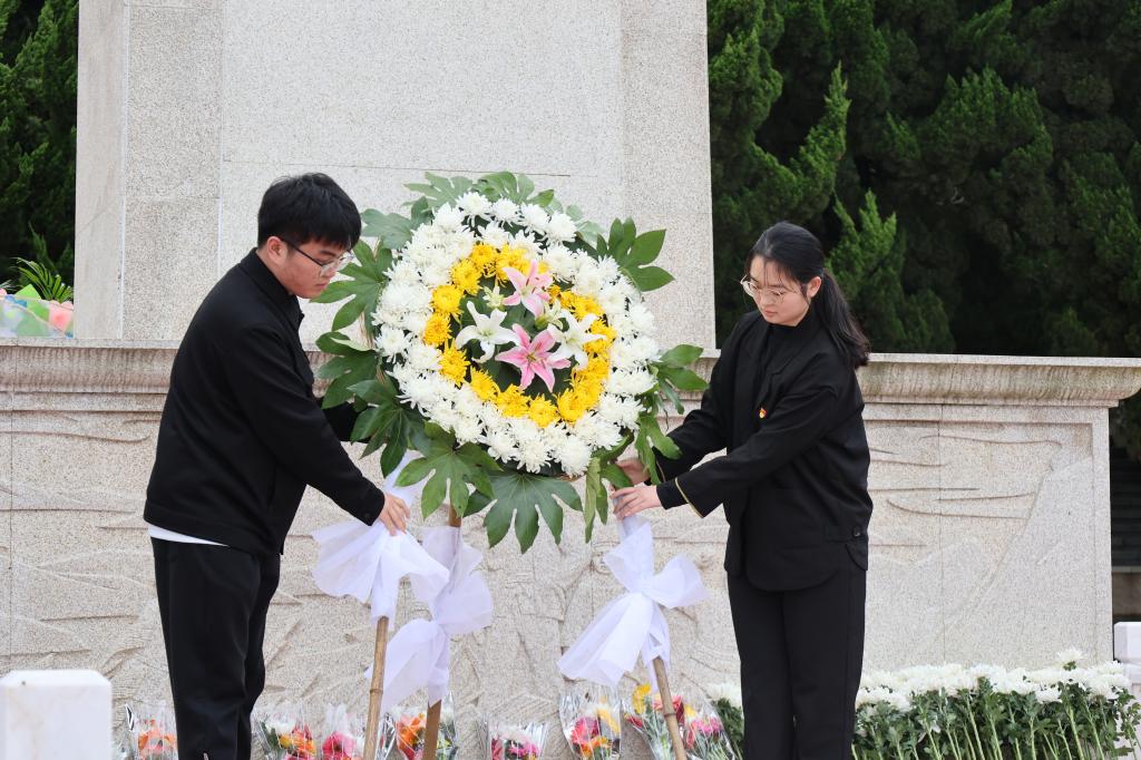 全体师生肃立,面向纪念碑默哀,而后敬献花圈,并向纪念碑三鞠躬。衡延笃作为教师代表发言,他介绍了在中国共产党的坚强领导下,中国人民为了和平做出的艰苦卓绝的努力,号召全体师生要不忘历史、铭记责任,学习、传承先烈精神,练就过硬本领,挺膺担当。学生党员代表朱光辉紧接着发言,他表示新时代的青年要继承先烈遗志,继往开来,奋发向上,为实现中华民族伟大复兴而不懈奋斗。随后,薛羚伟带领全体青马班同学以及现场所有的共青团员,一起重温了入团宣誓,并希望所有青年同学永葆对祖国纯粹和清澈的爱。