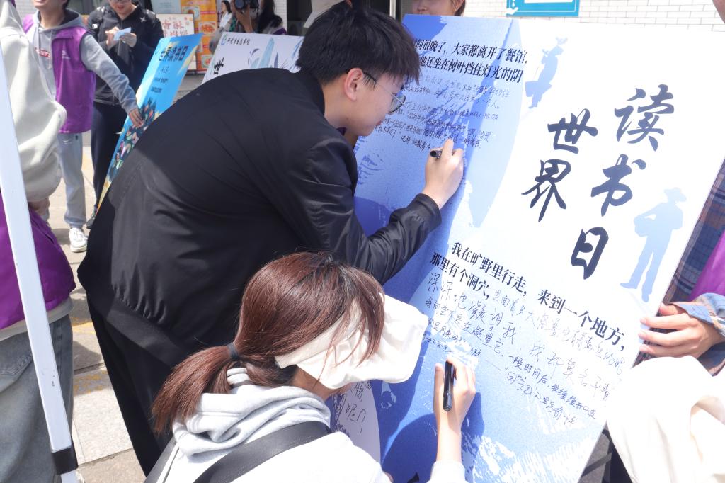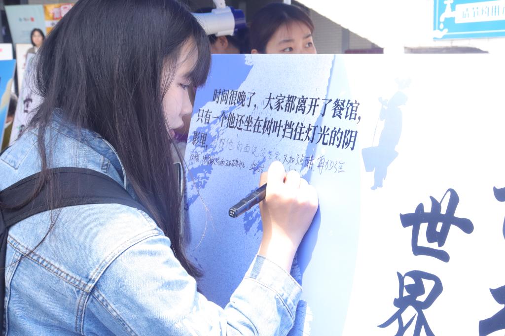 “续写接龙,以文会友”活动需要参与者通过展板上给出的故事开头,展开想象力,接力续写完善故事。同学们执笔挥洒,思维天马行空。有的幽默诙谐,有的哲思深刻,有的志向高远,有的贴近生活,展板装不下同学们的热情。在马克笔的交换间,在人来人往中,三个有趣的故事俨然成型。热烈的讨论声、笔尖的沙沙声交织在一起,构成了一幅充满活力和创造力的画面,让人感受到了文学的魅力和力量。