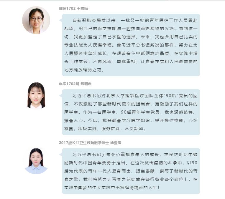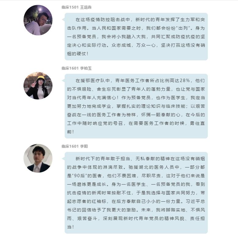 此外,医学院还有20多名学生党员提笔抒发自己心中的感慨。他们认为,身为“90后”的医学生党员,习近平总书记的回信给予了大家很大的鼓励,将激励大家继续坚守入党时的初衷和誓言,践行“健康所系,性命相托”的医学生誓言。未来,大家会努力提高专业水平,精进操作能力,将自己的所学用在人民需要的地方,用在国家需要的地方。作为“90后”的一代,会用实际行动来证明新时代青年人的家国情怀与责任担当。