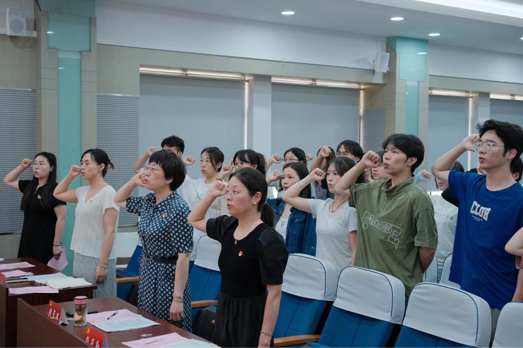 会议在庄严的《国际歌》中拉开帷幕。张志新宣读了2024-2025学年新发展党员名单。随后,面对鲜红的党旗,杨莉勤带领新发展党员一起高举右拳,庄严宣誓。“我志愿加入中国共产党……”铮铮誓言掷地有声,字字千钧激荡人心。党员同志们以铿锵有力的誓言表达对党的忠诚和为共产主义事业奋斗终身的决心。