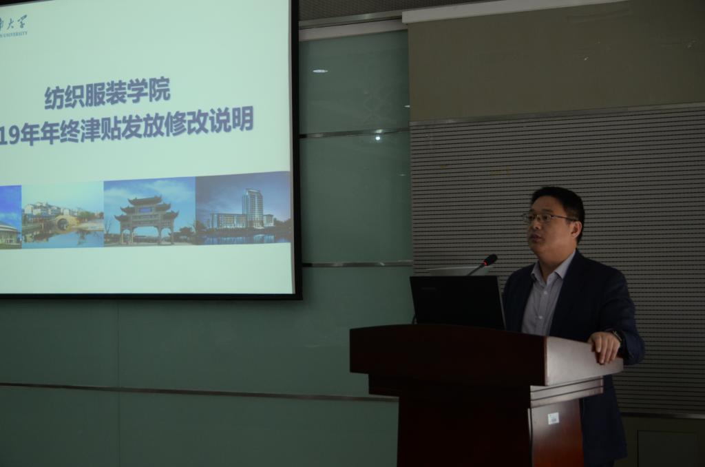 会上,付少海院长首先感谢全体教职工为学院发展所作出的努力与贡献,学院将下大力气,加强师资队伍建设,解决教职工后顾之忧,充分激发和调动全体教职工的积极性和创造性,促进学院的稳定发展。 接着,他就《江南大学纺织服装学院2019年度岗位考核与校内工作津贴发放办法》(以下简称《津贴发放办法》)作了要点修订说明。他主要对《津贴发放办法》文件中今年新修订的内容,如新引进教师考核办法、重点学科方向与科学研究突破、科研团队建设与考核、指导研究生工作量核算、大型仪器设备与测试管理等方面进行了详细解读与说明。他对前期两轮征求意见反馈的问题,如评教制度、职称晋升政策、科研专项奖励、工作量核算等作了客观分析与解答,与会代表举手表决全票通过了《津贴发放办法》。大会还审议并表决通过了学院书面财务工作报告。