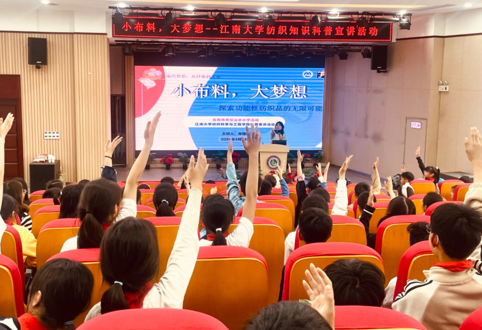 4月24日下午,纺织科学与工程学院“织”行科普实践团走进无锡市育红山水小学,在四年级、五年级小朋友中展开了一场“小布料,大梦想——探索功能性纺织品的无限可能”科普宣讲活动,将纺织知识与小朋友们天真美好的梦想紧密联系,“织”就一场奔赴未来的探索之旅。