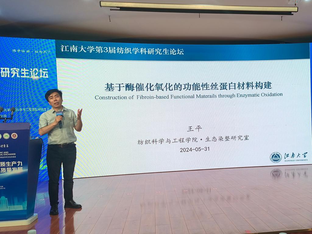 王平以《基于生物酶催化氧化的功能性丝蛋白材料构建》为题,就纺织品酶法加工功能化技术、酶在纺织品中的不同应用场景带来了精彩的汇报,以多样化的实例讲解让同学们进一步了解酶的广泛用途和优良性能,激励同学们努积极挑战科研难题,勇于突破自我。