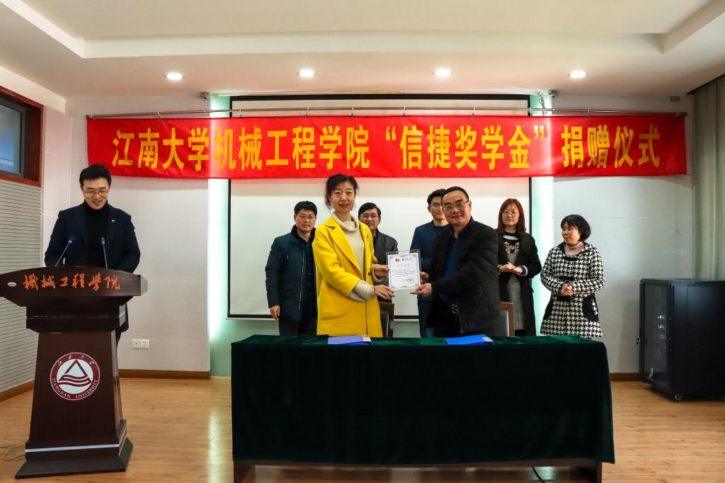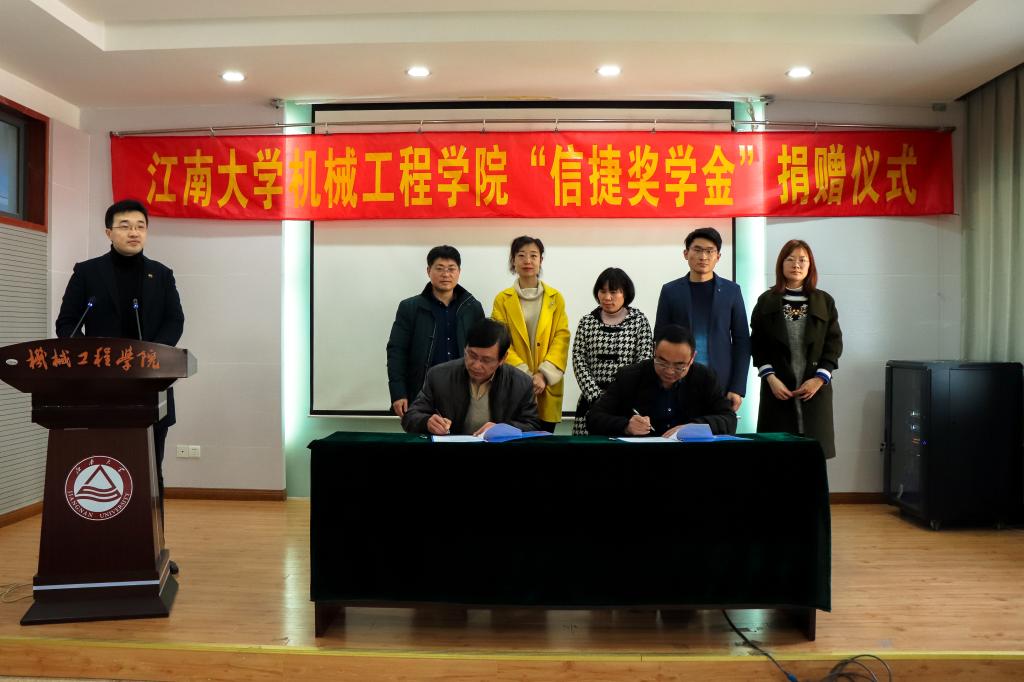 2019年3月12日下午,江南大学机械工程学院“信捷奖学金”签约捐赠仪式在机械工程学院C302举行。无锡信捷电器股份有限公司副总经理过志强先生、机械设计部经理房海英女士、校企合作部经理王正堂先生、人事专员张妍女士及校社会资源处副处长窦新华、院党委书记黄正明及副书记方俊出席了本次签约仪式。