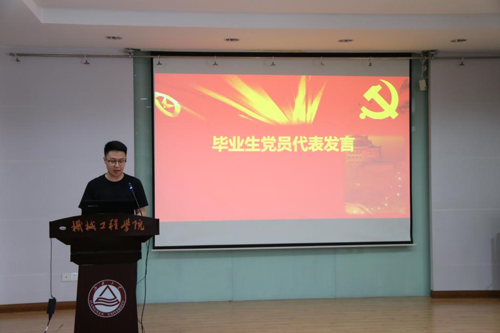 毕业生党员代表赵博文同学发言。赵博文表示,在机械工程学院的四年是一生中最难忘的时刻,在这里的所见所闻所学都是一生中最宝贵的财富。他表达了对学校、学院对所有学生的培养,感谢学院拥有全面的培养计划和雄厚的师资力量及专业的实验仪器及平台等,同时也表达了对机械学院所有教师的谢意,感谢老师对学生知识的传达和谆谆教诲,感谢身边同学,感谢父母。