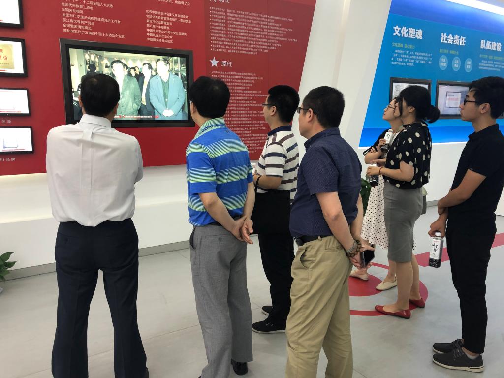 同日下午,参访团来到杭州娃哈哈集团有限公司,受到了娃哈哈集团副总经理潘家杰(包装90级校友)的热情欢迎。双方在会议室就产品技术与江南大学学科专业结合度进行了深切讨论,随后潘家杰带领方俊一行参观了哇哈哈展厅,了解哇哈哈的发展历程及技术创新、企业文化等内容,并在环幕影厅观看了哇哈哈集团在智能制造领域的发展。随后又来到车间观看智能生产线,通过现场的切实观感,其制瓶、灌装、包装全自动的智能生产过程让参访团叹为观止。