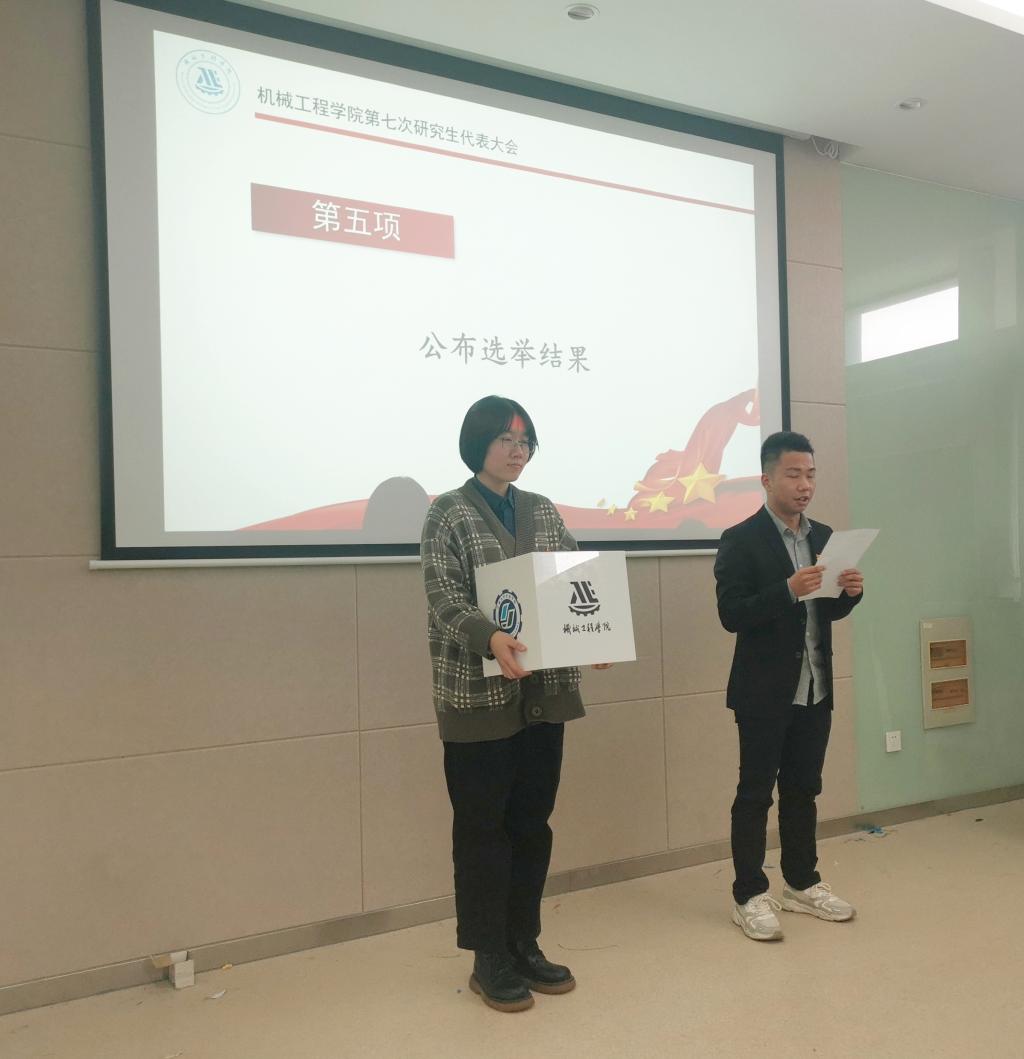 进入到会议的下一项议程,由张文祥同学宣读机械工程学院研究生会主席团候选人选举办法并介绍新一届主席团候选人,经过民主投票选举,张敏、梁怡良、张文祥3名同学当选机械工程学院新一届研究生会主席团成员。