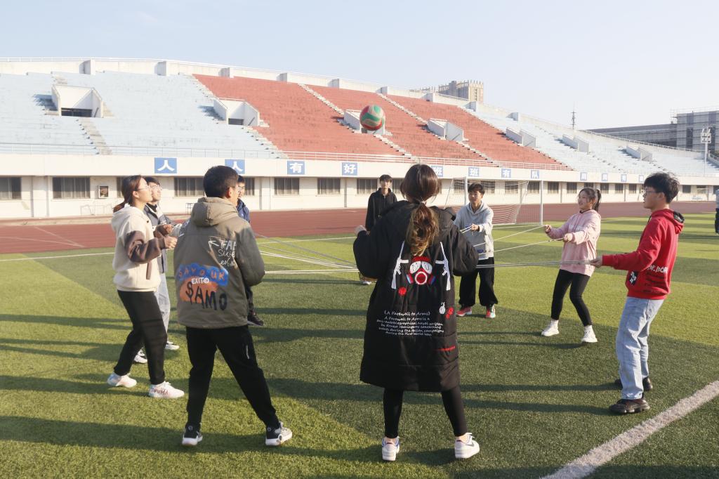 团体风采展示后的趣味项目考验了同学们的配合与默契。“旋风跑”中,一支长杆串联起了所有队员,大家沉着冷静,齐心协力迈向终点线。“同心鼓”中同学们迈着整齐的步伐,喊着有力的口号,心往一处想,劲往一处使。保密项目在同学们细心严密的规划下,也轻松完成。