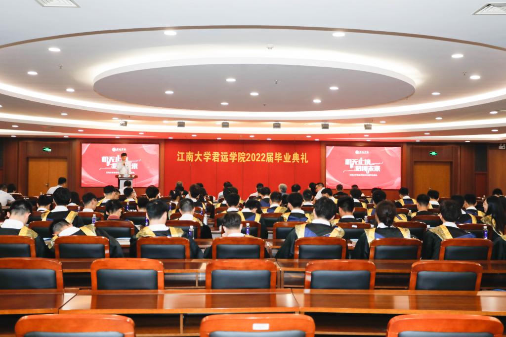 6月16日上午,江南大学君远学院2022届毕业典礼在我校图书馆五楼报告厅举行。无锡市委统战部副部长、侨办主任、君远学院理事会理事赵俊明,上海唐君远教育基金会理事、原江南大学副校长王武,上海唐君远教育基金会理事唐建年,江南大学党委常委、副校长、君远学院理事会理事长堵国成,校党委常委、宣传部部长倪松涛,学生工作部部长张菁燕,教务处处长徐学明,招生就业处处长赵建新,社会资源处处长黄敏,党委统战部副部长王冰等领导和嘉宾,以及机械工程学院、君远学院班子成员和部分教师代表参加了典礼仪式。学院辅导员高鑫主持仪式。