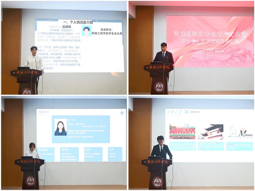 徐宇航宣读江南大学机械工程学院学生会主席团评选规则、研究生会主席团评选规则后,进入学生会、研究生会主席团候选人答辩评审环节。严冬等学生会候选人、孟卓等研究生会候选人依次上台答辩,他们对上一学年的工作进行总结,并介绍了下一阶段工作的开展思路与计划。秉承着公平、公正、公开的原则,现场的学生代表们在工作人员的组织下进行了无记名式差额选举的投票。