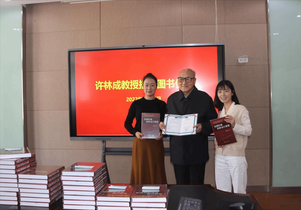 首先是赠书仪式。赵军华代表机械工程学院师生向许林成献花。许林成是无锡轻工业学院建院老教师,曾获中国包装工程学会授予包装科技教育终身成就奖,享受国务院政府特殊津贴。耄耋之年(91岁)再添力作,专著《包装机械创新设计原理》于2022年2月正式出版。接着,许林成分别向图书馆、学院师生捐赠40本《包装机械创新设计原理》。陶岚代表校图书馆接受捐赠并颁发学校捐赠证书,学院师生代表一一接受老先生亲手赠书并合影留念。