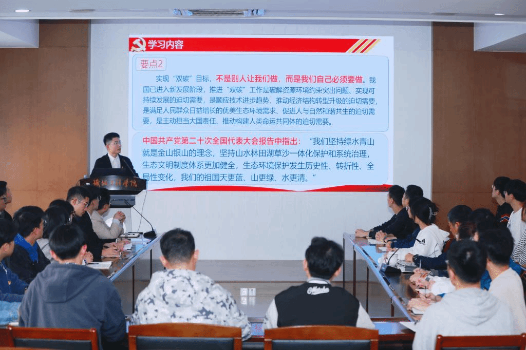 首先是理论学习。与会同志进行了《习近平谈治国理政》(第四卷)中《实现“双碳”目标是一场广泛而深刻的变革》的原文学习。官俊和受邀前来的教师党支部书记纪小刚教授、学生党员崔辰晖进行了领学。官俊结合党的二十大报告中关于生态文明建设的部分论述,领学了“实现碳达峰、碳中和目标的重要意义”部分内容;纪小刚领学了“实现‘双碳’目标需提高战略思维能力,处理好发展与减排、整体和局部、长远目标与短期目标、政府和市场四对关系”部分内容,并结合国家新能源产业布局、学院学科发展前景进行交流分享;崔辰晖领学了“国家推动实现‘双碳’目标的具体政策,包括加强统筹协调、推动能源革命、推进产业优化升级、加快绿色低碳科技革命、完善绿色低碳政策体系、积极参与和引领全球气候治理六个方面”部分内容。学生党员陆杨进行重点发言,说,通过今天的原文学习更加理解了实现“双碳”目标的重要意义,表示要努力培养创新精神,将所学专业知识应用到产业技术创新中,助力“双碳”目标的实现。学生党员方久康、牛云腾等进行了交流发言。