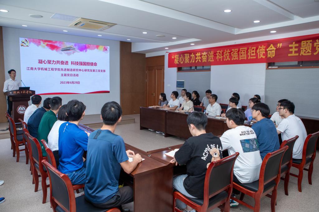 6月28日下午,江南大学校长陈卫参加机械工程学院先进制造研究中心研究生第三党支部“凝心聚力共奋进 科技强国担使命”主题党日活动。机械工程学院党委书记高雪梅、党委副书记刘升恒、分团委书记孟召双、辅导员余骏皓及各学生党支部书记列席,先进制造研究中心研究生第三党支部全体党员参加本次活动。