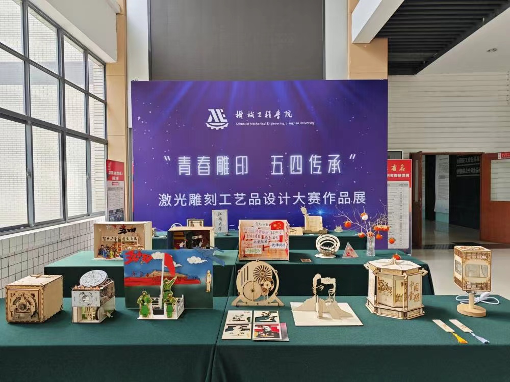 机械工程学院激光雕刻俱乐部,面向全校同学开展“青春雕印,五四传承”第八届工艺品设计大赛。学生在五四精神、“四史”学习中感悟精神伟力,感悟青年与社会发展的同频共振,用雕刻的艺术再现历史场景,用鲜活的艺术创造赓续红色血脉、砥砺奋进力量。其中,《缭乱光影》以错落摆放的木板为载体,打造了一个双面成像视错觉装置,通过向特定的角度投射光线,分别呈现出鲁迅先生和举着五四旗帜的两位青年的剪影;《更迭》以守序的时代、奋进的时代和昂扬的时代为主题,浓缩展现中国自五四运动后的发展历程;《跨越时空的对话》通过两侧分别呈现105年前五四运动青年学生走出学堂以及新时代青少年高举红旗向前辈奔跑的场景,寓意新时代青年牢记五四运动中前辈们的英勇付出,在全面建设社会主义现代化新征程中挺膺担当,奋勇争先。