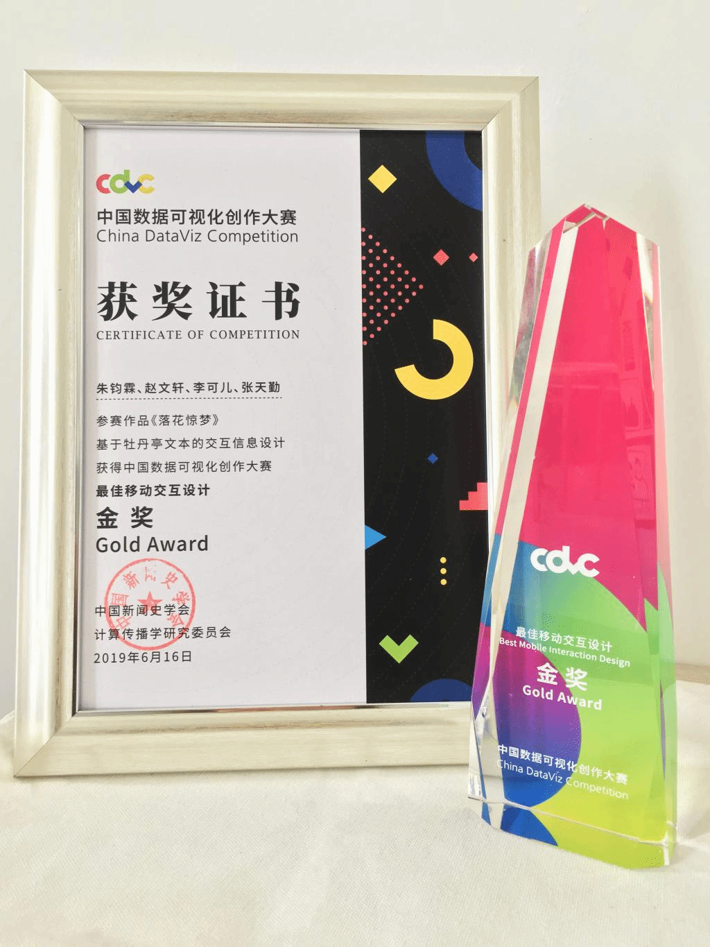 2019年6月16日,首届中国数据可视化创作大赛颁奖典礼于南京大学新闻与传播学院举行。由江南大学数字媒体学院数字媒体艺术学生朱钧霖、赵文轩、李可儿和数字媒体技术学生张天勤交叉合作完成的的设计作品《落花惊梦》,斩获了该大赛移动交互设计组金奖。该作品由在数字媒体学院教师龙娟娟、陈伟共同指导。