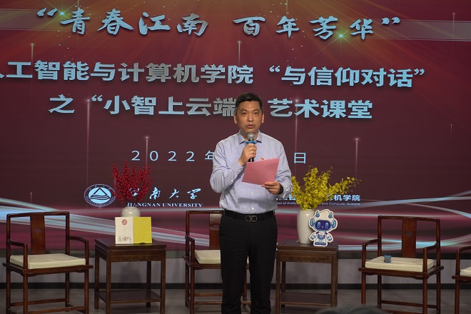 为丰富充实疫情期间的文化生活,喜迎党的二十大,激昂青春奋斗,在音乐沉浸中感受信仰的力量。5月6日下午,“青春江南 百年芳华”——人工智能与计算机学院“与信仰对话”之“小智上云端”艺术课堂顺利举办。无锡市教育系统关工委常务主任张志新、无锡市教育信息化和装备管理服务中心主任顾军、江南大学团委书记魏珍吉,江南大学关工委副主任娄国栋,人工智能与计算机学院党委书记张华,党委副书记兼副院长陈祎,江南大学特邀党建组织员曹秋萍出席活动,本次活动采用线上直播方式进行,校内外师生近75000人次通过直播平台参加线上互动。