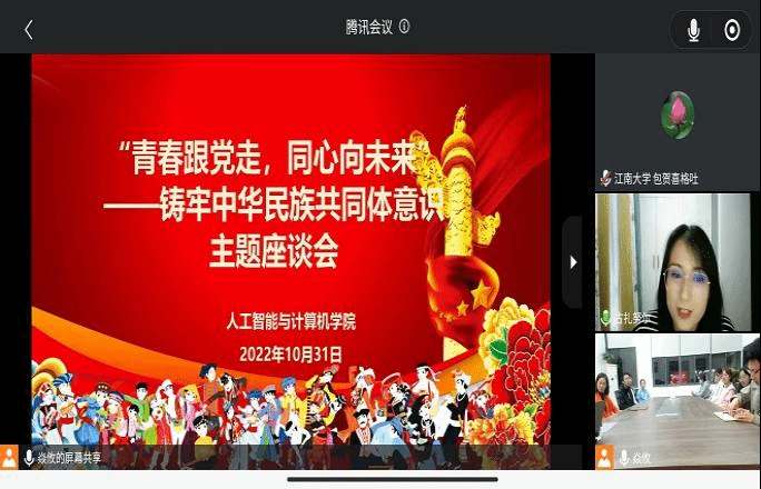 为进一步提升少数民族学生教育、管理和服务工作质量,铸牢中华民族共同体意识,10月31日晚,人工智能与计算机学院举办“学思践悟二十大,共筑智能石榴园”——铸牢中华民族共同体意识主题座谈会,本次座谈会采取线上与线下相结合的方式,共计100余名师生参会。人工智能与计算机学院党委副书记兼副院长陈祎、新疆维吾尔自治区教育厅派驻江南大学教师古扎努尔、辅导员戴士焱参加会议。
