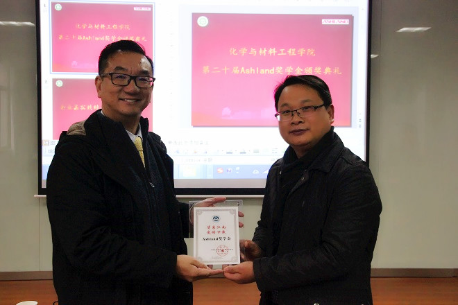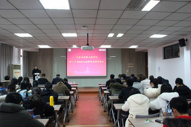 1月9日下午,化学与材料工程学院第二十届“Ashland奖学金”颁奖典礼于化工楼A316如期举行,亚什兰化学贸易(上海)有限公司个人护理品销售总监刘英才、高级客户经理唐松生、化工学院党委书记潘庆伟出席颁奖典礼,典礼由化工学院党委副书记田卫平主持。
