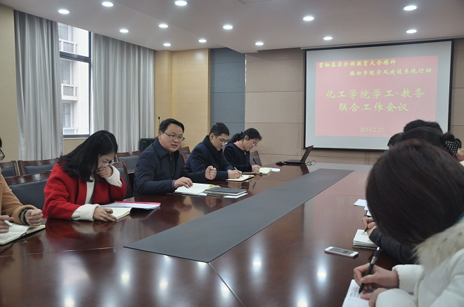 为继续贯彻落实全国教育大会精神,助推学院学风建设系统行动,2月27日下午,化工学院在化工楼A310会议室召开学工-教务联合工作会议。化工学院党委书记潘庆伟,党委副书记、副院长田卫平,副院长董玉明以及学工、教务全体教师参加了会议。