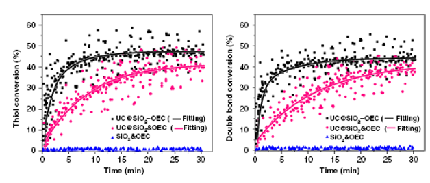感光材料中巯基及双键聚合转化率随光照时间的变化曲线图