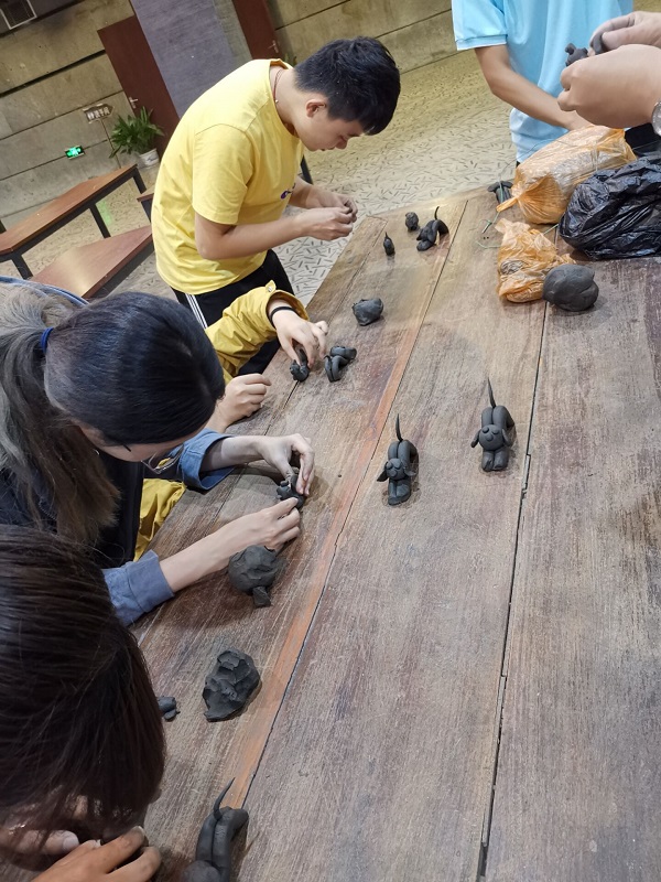 最后,团队队员来到了泥人博物馆,这里收藏着来自全国各地的泥人作品,记录了各地泥人从初始到繁荣至现在的情况。在解说员的带领下,队员们更详细地了解到了泥人的发展情况。参观之后,队员们在师傅的指导下亲自制作惠山泥人。惠山泥人用料严苛,需要用到特产于惠山脚下极适“捏塑”的惠山黑泥。在师傅的带领下,队员们尝试了最简单的动物形象,根据师傅的演示,只需要稍加改变,动物即可相互转化,妙趣丛生。这一点也让队员们更清楚地认识到了这一手工艺术需要高超的技术水平。