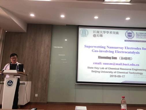 北京化工大学孙晓明教授应邀来我校化工学院进行学术交流,并于2019年9月17日上午在化工楼A316学术报告厅做了题为“Superwettting Nanoarray Electrodes Gas-involving Electrocatalysis”的精彩学术报告。潘庆伟书记主持了报告会,并对孙晓明教授的来访表示了热烈的欢迎。