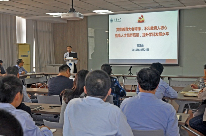 根据学校“不忘初心、牢记使命”主题教育的统一部署,10月24日下午,校党委常委、副校长顾正彪来到化学与材料工程学院,为学院青年教师上了题为“贯彻教育大会精神不忘教育人初心提高人才培养质量提升学科发展水平”的专题党课。化工学院党政领导、近三年入校的青年教师、各条线教师代表等50多人参加聆听。