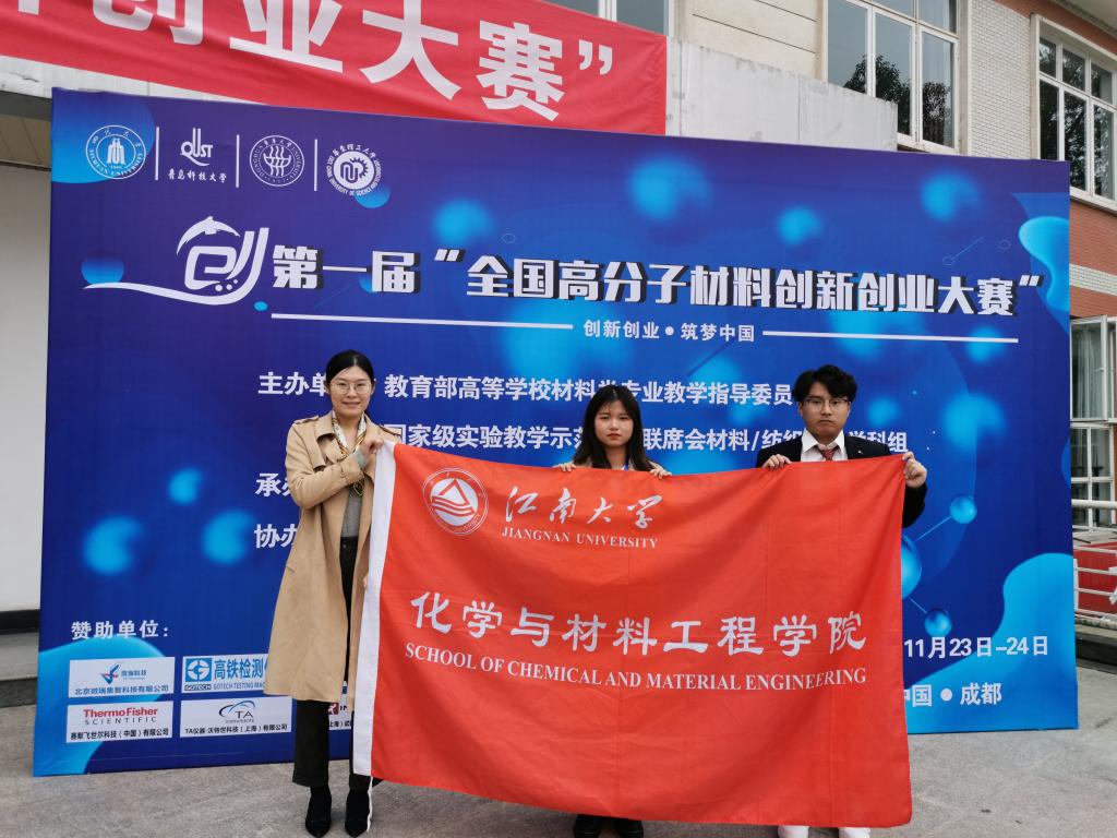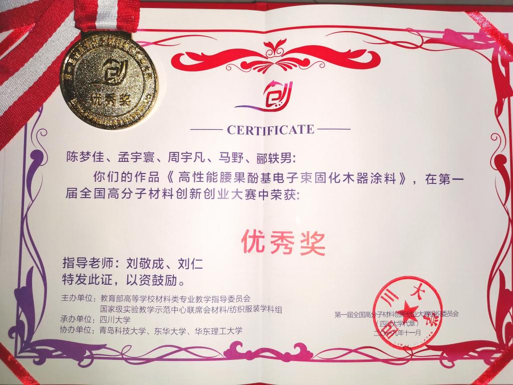 11月23-24日,第一届全国高分子材料创新创业大赛总决赛在四川成都举行。初赛共有来自全国94所高校的327支团队报名参加,来自天津大学、华南理工大学、东华大学等高校的40支参赛队伍进入总決赛。经过激烈角逐,我校化工学院参赛作品《高性能腰果酚基电子束固化木器涂料》获得大赛优秀奖。该项目由刘敬成、刘仁老师指导,陈梦佳同学负责。