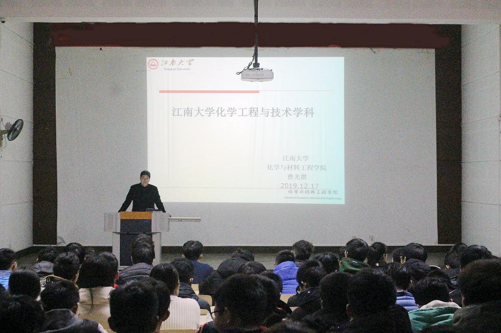 曹光群教授首先介绍了一些国内外知名日化公司的研究方向和基本情况,让同学们对本专业的发展情况有了更高层次的了解。通过行业间销售情况的对比,曹教授表示日用化工行业是一个欣欣向荣的行业。之后,曹教授对江南大学化工学院的历史背景、师资力量以及未来研究方向做了基本的介绍,曹教授指出,学院在表面活性剂、民用洗涤剂以及化妆品等方面保持着国内领先的地位,我们的理念是“保持国内第一,争做国际领先”,紧接着,曹教授说明了一些国际知名化妆品的主要成分,让同学们将日常可见的化妆品与自己所学知识联系起来。最后,曹教授向同学们提出了大学四年中学习生活的建议,曹教授希望大家在注意身体健康的基础上,学习多方面知识,拓宽自我,全面发展。