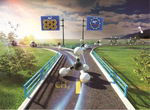 针对上述传统的认识和存在的问题,我校化工学院刘小浩教授团队通过改变催化剂的合成策略,将传统认为不具备甲烷无氧芳构化活性的Co/HZSM-5催化剂,创造性地构建了非钼基结构高度可控的单一钴活性中心(-AlF-O-Co(II)-O-AlF-),实现了甲烷分子中C-H键可控活化和高效转化。经多种表征和理论计算证实:1)该结构能有效抑制甲烷分子的深度脱氢,形成期望的CHx中间物种,进行随后的碳碳偶联、齐聚和环化脱氢形成芳烃;2)对于金属Co团簇而言,其更强的C-H键活化能力促使甲烷完全分解形成积碳,大幅降低目标产物芳烃选择性,且加速催化剂失活。该新型催化剂具有与钼基催化剂可比拟的催化活性,芳烃(主要为苯和萘)的选择性大于80%,打破了传统认为非钼基催化体系具有低的催化活性和芳烃选择性的一般认识和观点(图1)。该项研究为如何通过催化剂的结构设计调控反应物分子中化学键的活化(图2),提高催化活性、产品选择性和解决其它相关的关键技术难题提供了新的思路和方向。此外,运用该合成策略也成功开发了Ni/HZSM-5催化剂(图3),实现了甲烷无氧催化转化制芳烃,芳烃选择性约70%,而采用传统的浸渍法制备的镍基催化剂导致甲烷100%分解形成积碳和氢气,无法得到芳烃产品(Chem. Commun., 2020,56, 4396-4399,封面文章)。