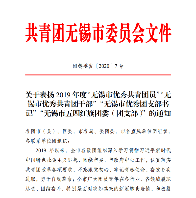 近日,共青团无锡市委员会发布《共青团无锡市委员会关于表扬2019年度“无锡市优秀共青团员”“无锡市优秀共青团干部”“无锡市优秀团支部书记”“无锡市五四红旗团委(团支部)”的通知》,共青团江南大学化学与材料工程学院委员会获得2019年度“无锡市五四红旗团委”荣誉称号。