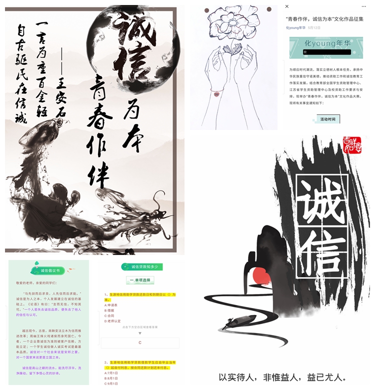 为引导学生深入思考诚信内涵,剖析在时代背景下诚信品质的重要意义,传播诚信正能量,学院通过微信平台推出“青春作伴,诚信为本”文创作品征集活动,学生通过绘画、书法、征文类文创作品抒发对“诚信”的深刻理解,活动开展以来收到近百余件作品,学生反响良好。