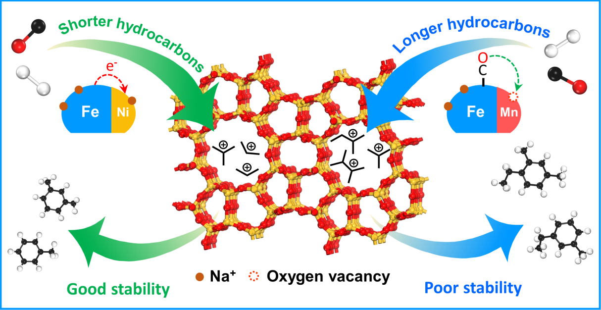 费托合成是将合成气(H2/CO/CO2)直接转化为超清洁燃料和高价值化学品的重要技术途径。铁基催化剂是常用的费托合成催化剂,它与烃类产物在HZSM-5上催化转化为芳烃具有相匹配的反应条件,这为将两种催化剂耦合在单反应器中一步催化合成气转化制芳烃成为可能。然而,这两类催化剂在固定床反应器中均容易失活,且反应过程极其多样复杂、难于控制,这使得合成气(CO/H2)在单反应器中一步高效制芳烃极具挑战。江南大学刘小浩团队创造性地构建Na调节的Fe-Ni双金属费托催化剂用于这一催化过程,同时解决了两类催化剂(金属与分子筛)的稳定性和选择性存在的问题(图1)。