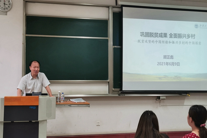 课上,顾正彪结合我校参与脱贫攻坚工作取得的经验、成果,阐述了脱贫攻坚的中国经验和振兴乡村的中国探索,详略得当地概括了我国扶贫开发的历史进程,讲解精准扶贫中必须解决的“扶持谁”“谁来扶”“怎么扶”“如何退”四个关键问题。讲述党和国家如何通过制定一系列的方针政策克服重重困难来实现 “全面脱贫”的伟大目标,引出了他对学生们在今后学习工作中的三点寄语:一是勤于思考,勇于创新提出举措;二是明确目标,满怀自信为之奋斗;三是脚踏实地,不务空名落实政策。最后,顾正彪再次以“全面脱贫”伟大事业为例,强调同学们一定要坚决拥护并理解领会国家的各项方针政策,正面看待政府为实现目标所采取的各项举措。