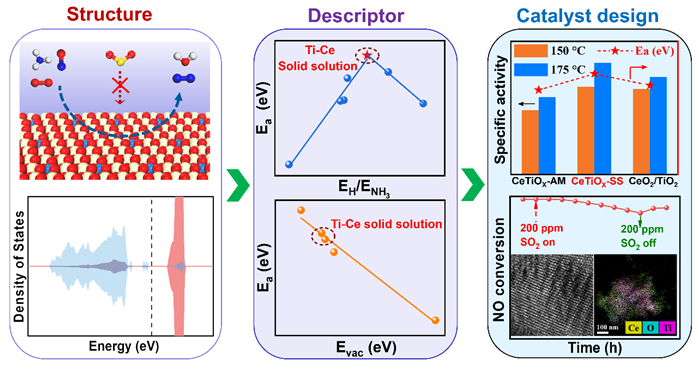 工业废气和机动车尾气排放的氮氧化物(NOx)是大气中细颗粒物(PM2.5)的主要前体物之一,还可产生光化学烟雾和硝酸型酸雨,严重危害人类生命健康和破坏生态环境。我国“十四五”规划提出了将NOx排放总量减少10%以上的减排目标。开发高效NOx催化净化(脱硝)催化剂是实现NOx减排的关键技术问题。在本项研究中,刘冰与刘小浩采用“DFT理论计算指导催化剂结构设计”的研究手段(图1),从原子水平上精确调控稀土二氧化铈(CeO2)的表面结构,获得了高活性、高耐硫性的Ce-Ti固溶体低温脱硝催化剂。通过综合分析DFT计算与实验结果,归纳出EH/ENH3和Evac是控制Ce-Ti催化剂活性的“反应描述符”。Ce-Ti固溶体结构的高活性源于其适中的EH/ENH3和Evac值。Ce-Ti固溶体中Ti位点特殊的几何结构和电子结构使其扮演着SO2捕获位点的作用,从而有效保护催化活性中心。该项研究为设计高活性、高耐硫性稀土铈基低温脱硝催化剂提供了新的认识和理论基础(图2)。