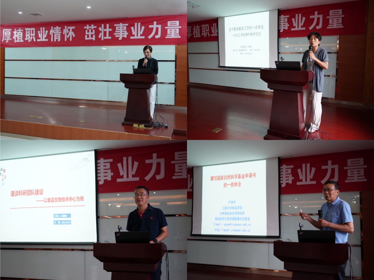 本次交流活动围绕青年教师教书育人、科学研究及在团队中成长等方面展开。食品学院王海鸥老师做了教育教学经验的分享。她向大家阐释了“为什么做老师”“如何做好老师”两大问题。她强调了“启发式教学”的重要性,采用若干真实教学案例,生动还原了教学场景,深刻剖析了教学思路。她同时分析了学校、学院和青年教师在教育教学方面的现状及问题,提出了一系列解决办法。最后,她以“人皆可以为尧舜”结束分享,勉励在座青年教师坚守教书育人初心,成为德高望重的好老师。食品学院教授、杰出青年基金获得者严秀平老师做了关于撰写国家自然科学基金申请书的报告。他讲解了如何从评审专家的审视角度撰写申请书,从选题、研究目标、研究内容、拟解决问题、研究方案和技术路线、预期研究结果、可行性和创新性展示、工作基础、前期准备、参考文献等方面入手,详细解读了国家自然科学基金项目申请过程的各个环节与细节。招就处处长、食品学院生物技术中心赵建新老师做了有关团队建设的经验分享。他首先阐明了“为什么建团队”,然后从团队组建、团队成员、团队管理几方面分别做了深入讲解。他强调,团队要“有所为有所不为”,发展是硬道理;团队成员要志同道合,和而不同;团队管理中要做好计划,关键是落实。团队中要塑造家文化,团队成员之间要主动补位,建立良好的沟通渠道。三位老师的分享让大家获益匪浅。