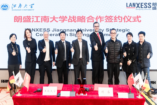 在嘉宾的共同见证下,马丕明和Michael Rockel分别代表江南大学化学与材料工程学院和朗盛化学签署战略合作协议,并与嘉宾合影留念。