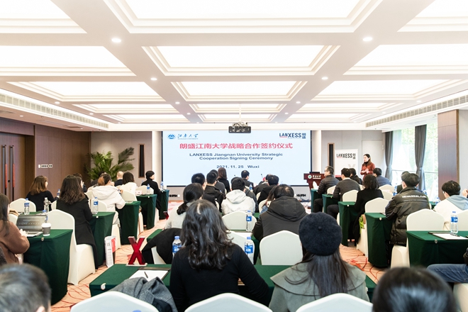 11月25日上午,江南大学—朗盛战略合作签约仪式在我校举行。无锡市人民政府外事办公室副主任詹熠、无锡高新区招商发展中心副主任惠人杰、朗盛化学高性能材料业务部大中华区销售及市场总监兼朗盛(无锡)高性能复合材料有限公司总经理Michael Rockel、朗盛(无锡)副总经理Waihong Loh、朗盛(常州)总经理兼朗盛大中华区技术创新总监胡东祺、朗盛化学亚太区企业传播负责人Ulf Drssler,江南大学化学与材料工程学院党委副书记田卫平、副院长马丕明、院长助理黄云鹏以及化学与材料工程学院师生代表等出席签约仪式。仪式由化学与材料工程学院辅导员高静主持。