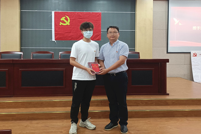 在随后的环节中,学院领导、行政党支部教师和各学生党支部书记共同为预备党员佩戴党员徽章,颁发党章和党史学习教育笔记本。新党员梅佳冰同学激动地说:“戴上党员徽章的一瞬间,感受到的不仅仅是喜悦,还有那一份沉甸甸的责任。我将不负期望,肩负使命,继续前行!”