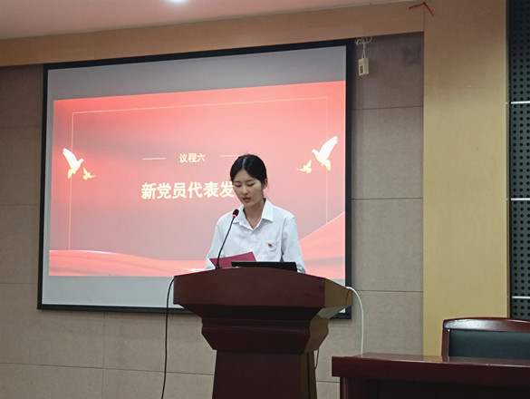 在共同学习观看《读懂中国》江南大学老党员陶文沂微视频之后,全体新党员心潮澎湃,现场响起热烈的掌声。新党员代表姜雨同志发言,她表示身为朝气蓬勃的化工学子,应主动钻研自身专业技能,加强实验操作与科研能力,既要得到真学问、练就真本领,又要有锲而不舍、自强不息的奋斗精神。她代表新党员向党做出庄严承诺,在现阶段会勤学苦练,打牢基础,争取在将来为化工行业的蓬勃发展注入化工力量,让祖国以更强大的姿态站在国际舞台上。