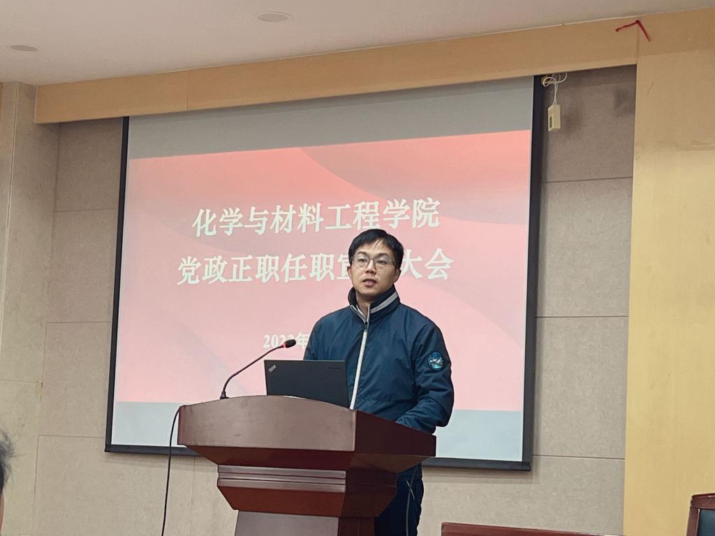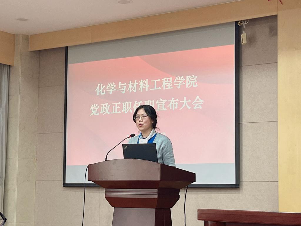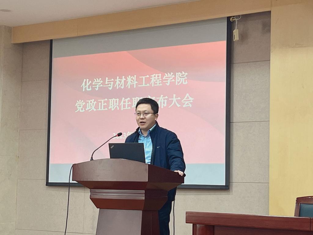 顾正彪宣读了学校党委关于潘庆伟同志、刘仁同志的职务任职决定,任命潘庆伟同志为化工学院党委书记、刘仁同志为化工学院院长。随后,顾正彪作重要讲话,指出这次中层干部的换届调整,既是学校干部任期目标责任制的例行工作,也是优化班子结构、促进改革发展的一项重要举措。校党委严格遵循干部选拔任用规定,经过反复酝酿、通盘考虑和慎重研究后做出以上决定。他对化工学院上一届党政班子在2020-2022年任期中取得的成绩表示高度肯定,对于全体教职工共同努力表示衷心感谢。同时,他对学院新任期、新班子提出了几点建议:一要旗帜鲜明讲政治。坚持社会主义办学方向,坚持立德树人根本任务,强化党政同责、一岗双责意识;二要敢于担当善作为。要抢抓发展机遇,紧扣国家战略和学校发展,在新一轮任期目标的制定实施中,前瞻思考、主动作为,努力开辟发展的新领域新赛道,不断塑造发展新动能新优势;三要团结协作聚合力。牢固树立“一盘棋”思想,围绕中心工作,密切配合、通力协作,将“多条线”拧成“一股绳”;四要以身作则当表率。学院领导班子岗位重要、备受关注,要从严治院、从严律己、从严带队伍,让好作风出生产力、强战斗力。