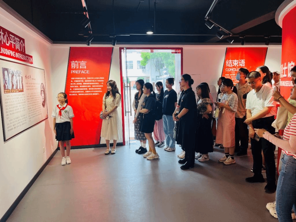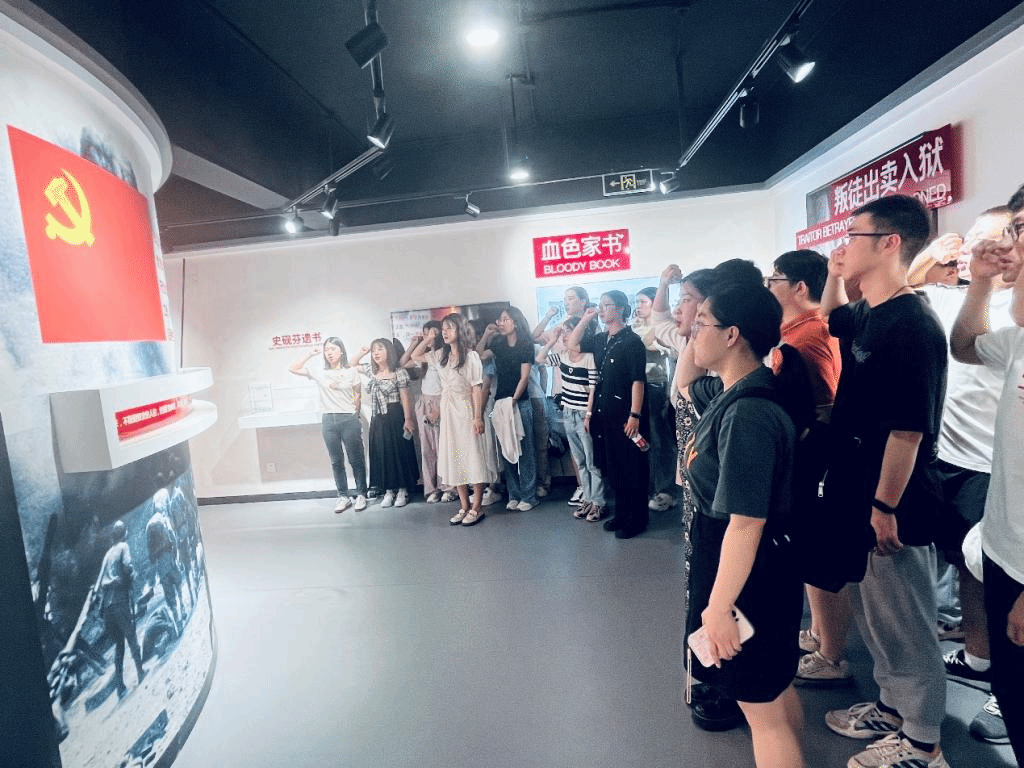 瞻仰雨花英烈,缅怀秋瑾英雄。40余名党员到达官林镇小学,在讲解员吴怡玲的带领下参观了林心平史砚芬烈士纪念馆,瞻仰了牺牲时年仅23岁的抗日女战士—林心平,以及“家书传浩气,丹心照汗青”的史砚芬。讲解员以两位烈士成长故事为线索,讲述革命先烈为了民族解放和人民幸福而战斗、牺牲的感人故事。随后辅导员李晓洁带领全体党员面向党旗,重温入党誓词,铿锵有力的宣誓声响彻大厅。全体党员牢记入党誓词,叩问初心、守护初心,坚守使命、担当使命,做到初心如磐、使命在肩。