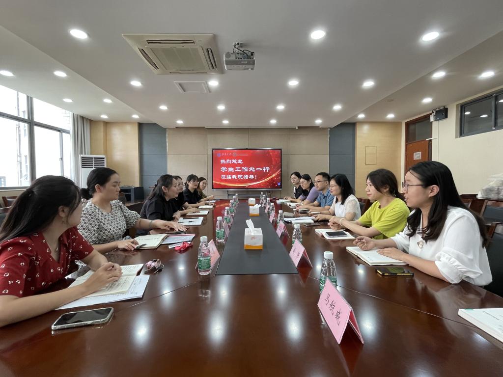 董霞代表学院对学生工作处一行的到来表示欢迎。她简要介绍了学院辅导员的条块分工及学院学风建设情况,并指出学院在本科生人才培养、研究生心理健康教育中面临的难点问题及建议,希望职能部门与二级学院之间加强联动,进一步完善工作机制,增强学风建设实效性。