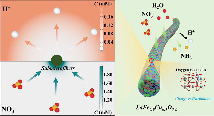 基于此,该团队受Haber-Bosch催化剂和固氮酶中Fe活性位点的启发,报道了一种具有高效电催化合成NH3性能的钙钛矿型电催化剂。利用B位阳离子替换策略构建了一系列富氧空位的钙钛矿氧化物LaFe0.9M0.1O3-δ(其中M为Co、Ni和Cu)亚微米纤维(简称为LF0.9Co0.1、LF0.9Ni0.1和LF0.9Cu0.1亚微米纤维)。例如,LF0.9Cu0.1亚微米纤维表面存在非均匀电荷再分布和丰富的氧空位,以及更正的表面电势和较低的功函数,这些特性共同作用使得该纤维能够增强对NO3-离子的吸附能力。同时,通过构建具有更正的表面电势的催化剂,有利于解决由于传质能力弱和电极区域浓度梯度小而导致的低活性问题。因此,LF0.9Cu0.1亚微米纤维展现出了最佳的NH3产率和法拉第效率。结合COMSOL Multiphysics模拟和原位表征以及第一性原理计算发现,通过Cu在B位上的取代,成功降低了控速步的势垒,从而促进了反应的进行。这一研究揭示了Cu取代在该反应中的重要作用,为研究钙钛矿型电催化合成NH3催化剂的设计和开发提供了新的思路。