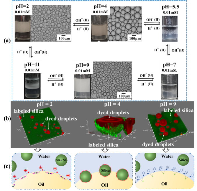 (a) 0.1 wt.% SiO2颗粒与0.01 mM di-UAPAc协同稳定的乳状液随pH变化的智能响应示意图;(b)乳液滴液的3D微观示意图;(c)微观机理示意图