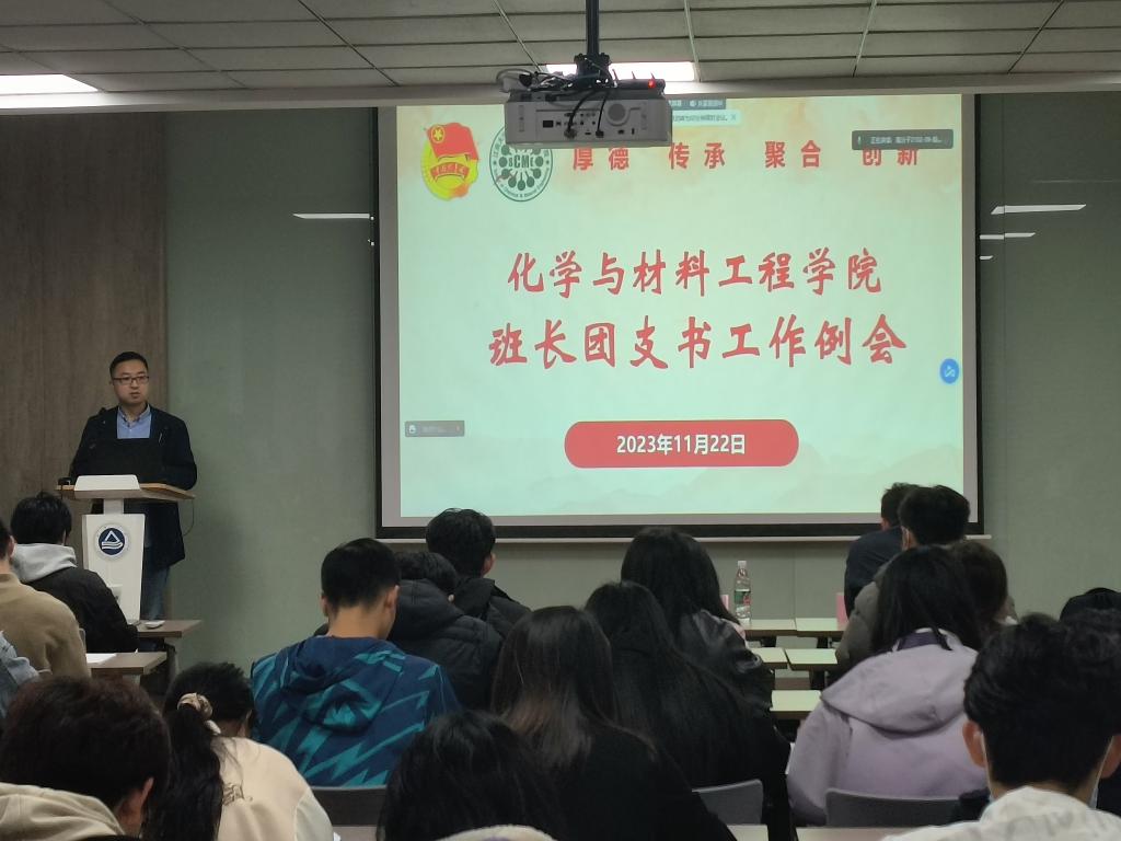 为深入学习贯彻习近平新时代中国特色社会主义思想,进一步提升学院基层团学干部的理论素养和实践能力,化学与材料工程学院于11月22日召开班长团支书工作例会。会议设置蠡湖和东氿两个会场,马克思主义学院专任教师巩建青、学院分团委书记鞠峰、各班级班长、团支书及分团委部门负责人参加会议,会议由鞠峰主持。