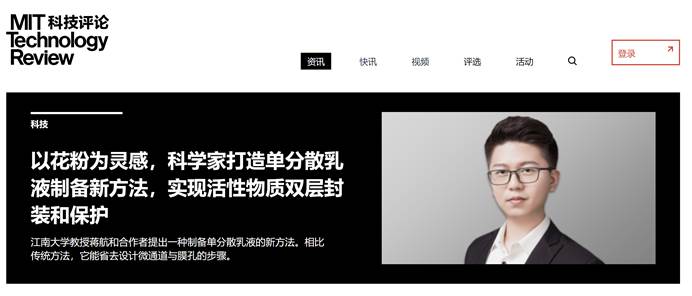 近期,《麻省理工科技评论》(MIT Technology Review China)对化学与材料工程学院青年教师蒋航进行了专题采访,并以封面形式发表于中国官方网站及公众号。该采访的主题为“以花粉为灵感,科学家打造单分散乳液制备新方法,实现活性物质双层封装和保护”,重点报道了蒋航老师近期在单分散Pickering乳液制备方面的最新研究成果及未来研究设想。